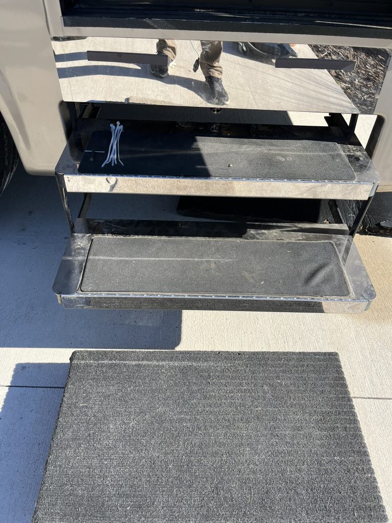 Close the door and observe the retraction process. The steps should fold back up completely and seat properly against the RV’s body. If you notice any stuttering or incomplete movements, this could indicate that certain grease points need additional attention or that there’s an underlying mechanical issue beyond basic lubrication needs.